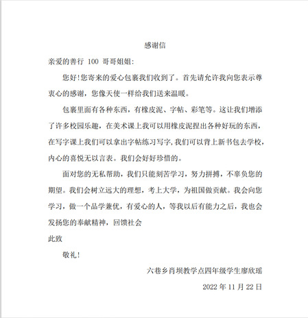 2022年12月1日,历时45天,共三期的善行100活动圆满结束,1.4万余元的爱心善款已经全部通过中国乡村振兴基金会以“暖冬爱心包裹”的方式送至陇南市西和县六巷乡闫坝教学点,这份礼物里包含冬衣,书包、彩笔、橡皮泥、字帖等各种好物,小朋友们收到包裹时欣喜溢于言表,第一时间拿出橡皮泥捏出各种好玩的花样。志愿者们相信感受到温暖的孩子们,未来有一天也会成为一名善行100爱心传递者、志愿服务的接力者,跨越山河,传递爱心与温暖。